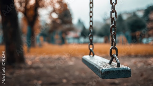 An empty swing set hangs from chains in a park setting. Trees and foliage provide background