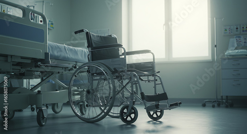An empty wheelchair sits next to a hospital bed in a sterile, sunlit room.