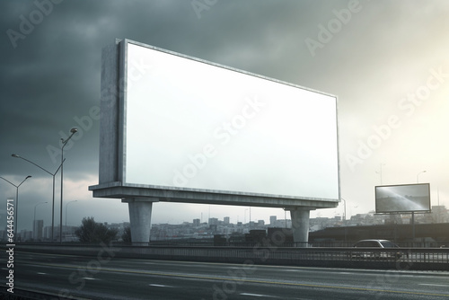 an empty white billboard for your advertising stands in near the road in a large urban metropolis. blank advertising billboard mockup on the road. blue sky background. Generative AI