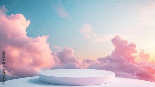 an empty white circular podium against the backdrop of a pastel sky with clouds