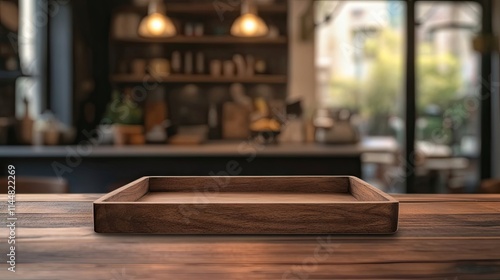 An empty wooden tray takes center stage with a blurred kitchen interior behind, highlighting a minimalist approach in a tastefully styled dining space, offering ample copy space.