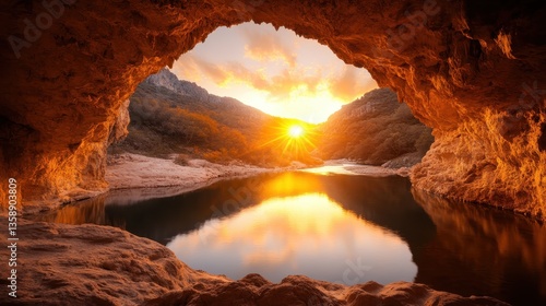 An enchanting cave view showcases a vibrant sunset reflected on calm waters, with the rugged cave walls creating a stunning backdrop for this peaceful natural scene.