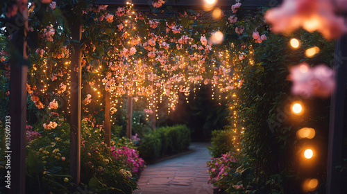 An enchanting evening scene illuminated by fairy lights hanging among flowering shrubs, creating a magical ambiance.