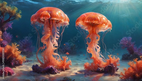 An enchanting illustration of a jellyfish dancing in a vibrant coral reef, showcasing the delicate beauty and diversity of ocean life, Generative AI