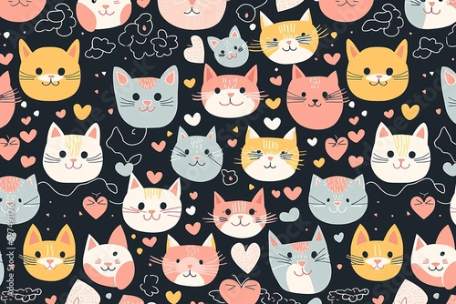 An enchanting seamless pattern that celebrates the irresistible cuteness of cat faces. The pattern showcases a variety of stylized cat faces, seamless pattern with cats black background, Generative AI