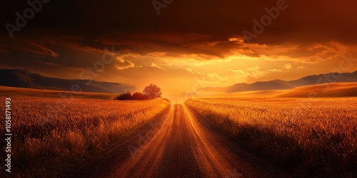 An enchanting sunset illuminates a serene dirt road winding through golden fields, with distant hills silhouetted against a dramatic sky, creating a tranquil and picturesque landscape.