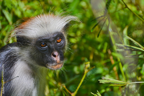 An endangered Zanzibar red colobus monkey (Piliocolobus kirkii), sitting on a tree at Jozani forest, Zanzibar