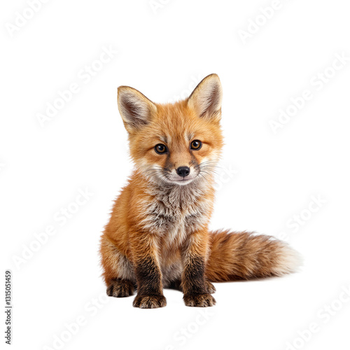 An endearing baby fox with vibrant orange fur and large eyes exuding charm and curiosity against a pristine white backdrop