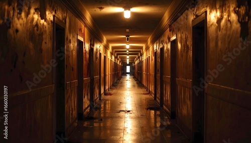 An endless abandoned asylum hallway, flickering lights casting shadows on walls oozing dark ichor, distorted faces fleeting in silence — a cinematic horror wallpaper full of dread and suspense.