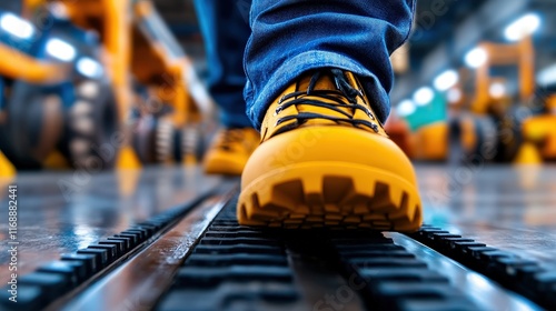 An engaging close-up captures yellow safety boots in action, stepping confidently on tracks in an industrial setting, highlighting themes of hard work, safety, and the strength required in manual lab