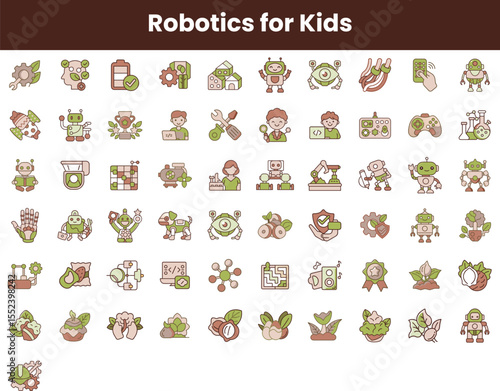 An engaging collection of playful robotics icons for kids, featuring colorful illustrations of robots, tools, and educational symbols that inspire creativity and learning.