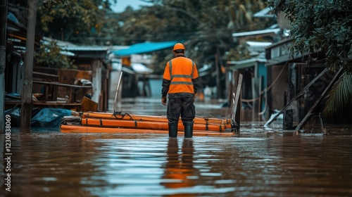 An engineer at a flood-affected area, inspecting a temporary bridge and rescue boats.