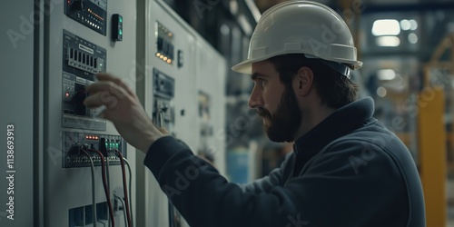 An engineer in a hard hat thoroughly examines a complex control panel inside a high-tech industrial environment.