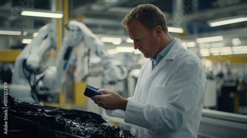 An engineer in a lab coat examines a car engine component with a thermal imaging camera. The well-lit factory features automated assembly lines and robotic arms in the background