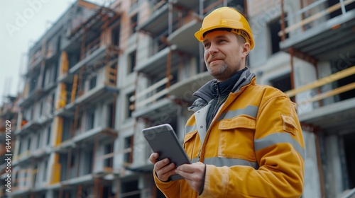 An engineer in a yellow jacket and hard hat inspects construction plans on a tablet