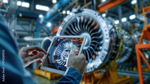 An engineer uses a tablet with a holographic innovative application, to model and design and monitor a 3D model of an aircraft engine while on an automated robotic line at an aerospace factory