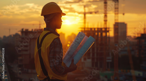 An engineer wearing yellow hard hat, blueprints in hand, looking out over the construction site
