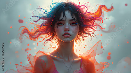 An enigmatic and fluid character with no defined hair but instead a flowing aura of vibrant colors Her eyes are abstract shapes that seem to change and shift
