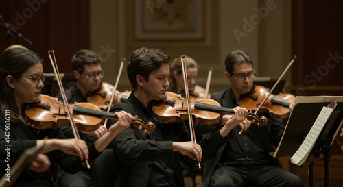 An ensemble of musicians performing in a formal concert setting, showcasing the beauty of string instruments, primarily violins, and the art of music execution.