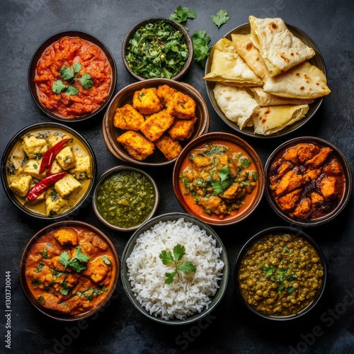 An enticing arrangement of colorful Indian curries, breads, and rice showcases a variety of flavors and textures, inviting a culinary adventure that celebrates rich spices and fresh ingredients