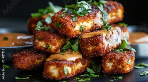 An enticing arrangement of fried tofu stacks garnished with fresh herbs and drizzled with a creamy sauce, offering a delicious and satisfying dish for any meal.
