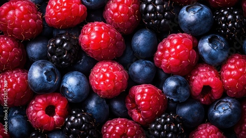 An enticing assortment of fresh berries featuring vibrant raspberries, blueberries, and blackberries, showcasing their rich colors and natural textures in a delicious arrangement.