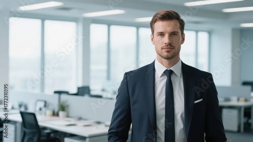 An entrepreneur in formal attire presents a professional image in front of the office environment background, demonstrating the decision-making power and leadership in the business field.