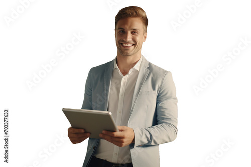 An entrepreneur uses a tablet freelancer business man smiling in business clothes shirt in the office. Transparent background.