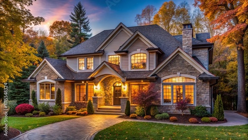An evening view of a stone and timber home with warm lighting illuminating the windows and surrounding landscape, casting a comforting glow against the backdrop of a fall forest.
