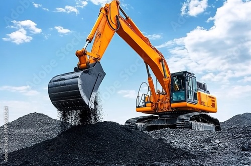 An excavator is digging in the coal mine, with a blue sky and white clouds above it
