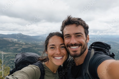 An excited couple embraces during their hiking trip surrounded by green landscapes, celebrating nature's beauty and their joyful companionship. A moment of tranquility.