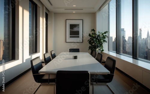 An executive conference room with a modern white table, paired with streamlined black office chairs.