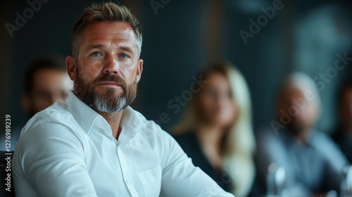 An executive in a white shirt looks confidently towards the future during a corporate conference, symbolizing leadership and strategic vision in a competitive industry.