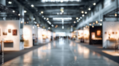 An expansive art exhibition hall featuring various displays, illuminated by bright lights and bustling with visitors.