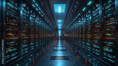 An expansive data center filled with rows of servers glowing with blue and green lights, with technicians in futuristic uniforms working on the equipment.