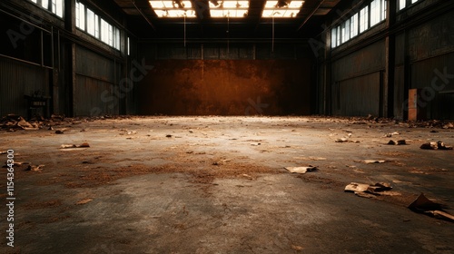 An expansive, desolate warehouse interior featuring scattered debris across the concrete floor, with sunlight filtering through its broken windows, creating a somber atmosphere.