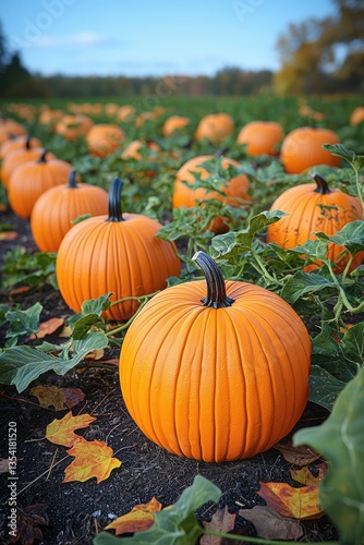 An expansive field full of round orange pumpkins in nature