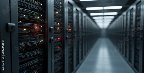 an expansive server room, organized with rows upon rows of metallic server racks