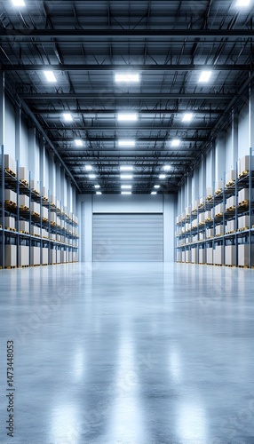 An expansive warehouse with rows of shelves stocked with cardboard boxes, illuminated by overhead lights and featuring a large roll-up door at the end