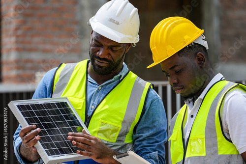 An experienced construction foreman mentors a young apprentice on a building site. The senior engineer uses a tablet to explain project details, providing on-the-job training and guidance.