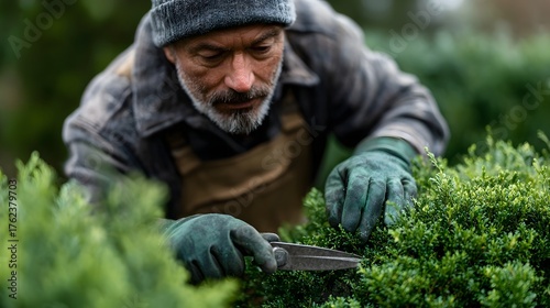 An experienced gardener meticulously trims a lush green bush with pruning shears outdoors