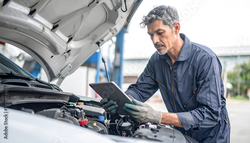 An experienced senior male mechanic holds a tablet and uses an application to check and analyze car problems.