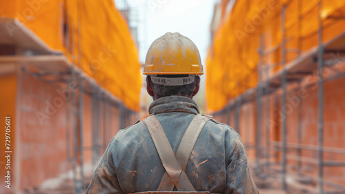 An expert construction worker tours a residential complex under construction during the workday. Urban infrastructure development for the growth of the city