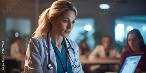 An expert physician sitting at her desk in a sleek, contemporary office space. The doctor is engrossed in their work, looking at the medical data on her laptop. Generative AI