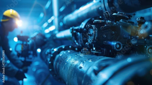 An Expert technicians are diving to install underwater oil and gas pipelines in blue undersea industrial equipment for energy transportation.