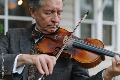 An expert violinist immersed in a classical melody, his black suit complementing the aged elegance of the instrument in his hands