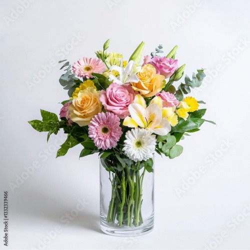 An exquisite arrangement of vibrant flowers including roses, lilies, and daisies, artfully styled in a sleek glass vase, spotlighted against a pure white backdrop.