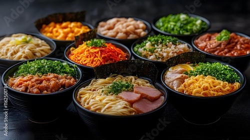 An Exquisite Array of Ramen Dishes Showcasing Unique Noodle Types, Broth Flavors, and Colorful Toppings that Celebrate Ramen's Culinary Diversity
