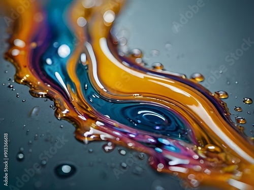 an exquisite macro photography closeup of a long, mesmerizingly flat splash of iridescent matte liquid, reminiscent of volcanic glass, with a subtle sheen, as it spreads out Generative AI