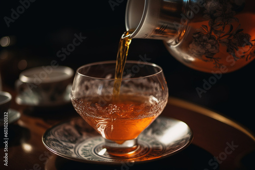 An exquisite teapot pouring tea into a transparent glass teacup, allowing the viewer to appreciate the color and clarity of the tea during the ceremony Generative AI